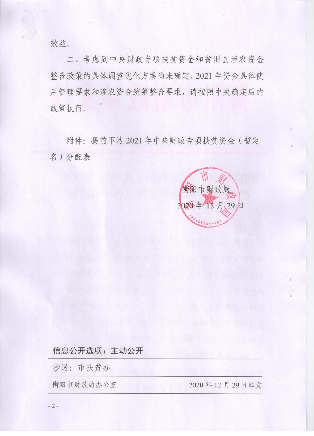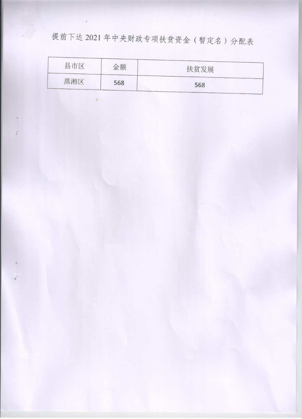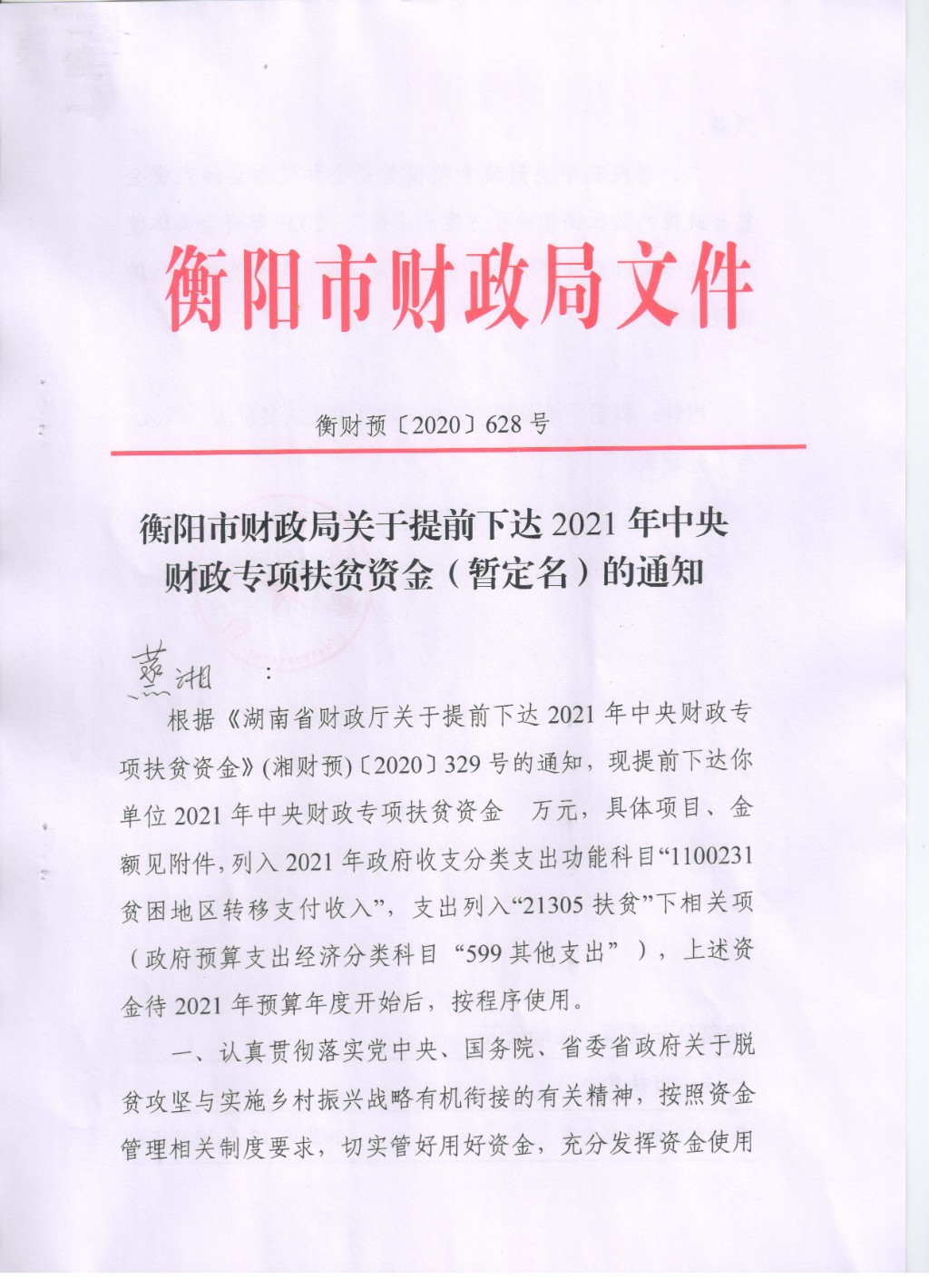 衡阳市财政局关于提前下达2021年中央财政专项扶贫资金(暂定名)的通知