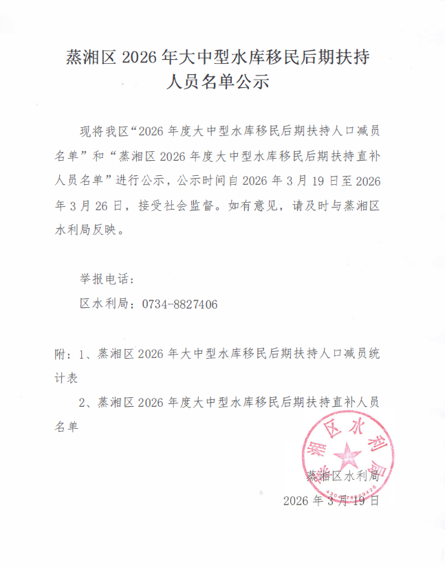 蒸湘区2026年大中型水库移民后期扶持人员名单公示
