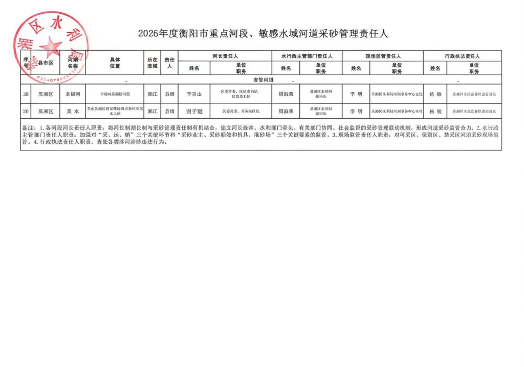 2026年度衡阳市重点河段、敏感水域河道采砂管理责任人