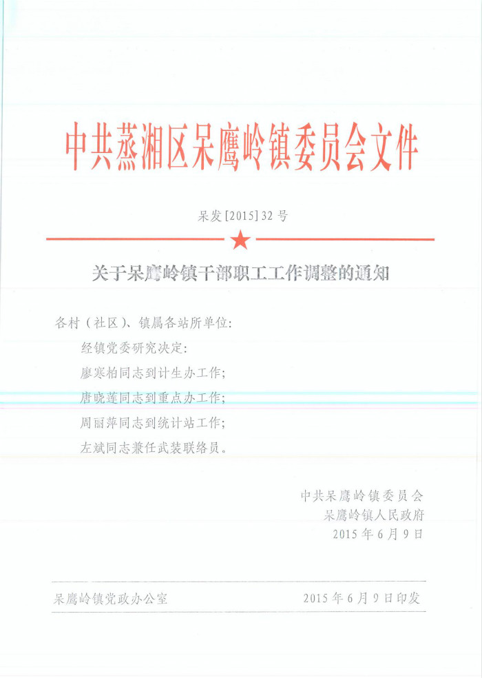 呆发【2015】32号关于呆鹰岭镇干部职工工作调整的通知