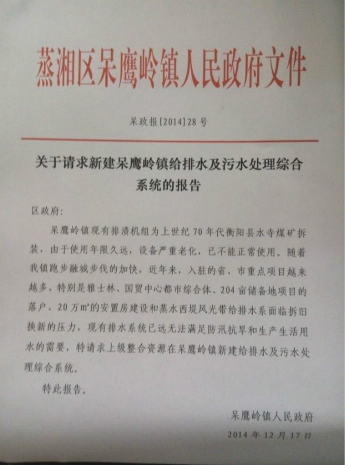 呆政报【2014】28号 关于请求新建呆鹰岭镇给排水及污水处理综合系统的报告