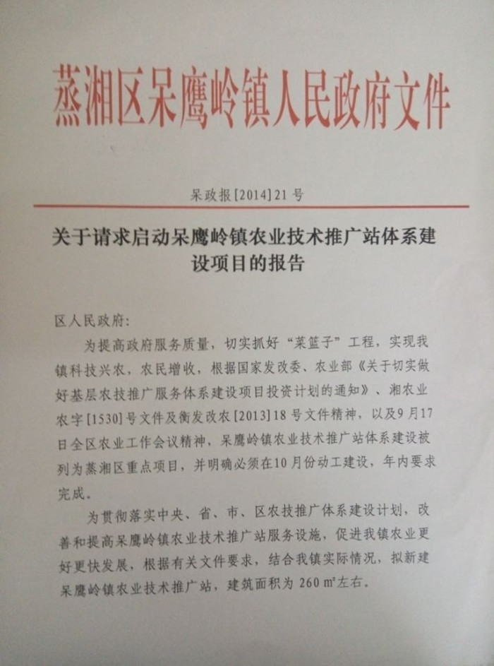 呆政报【2014】21号 关于请求启动呆鹰岭镇农业技术推广站体系建设项目的报告