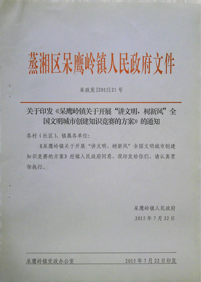 呆政发【2015】21号关于印发《呆鹰岭镇关于开展“讲文明、树新风”全国文明城市创建知识竞赛的方案》的通知