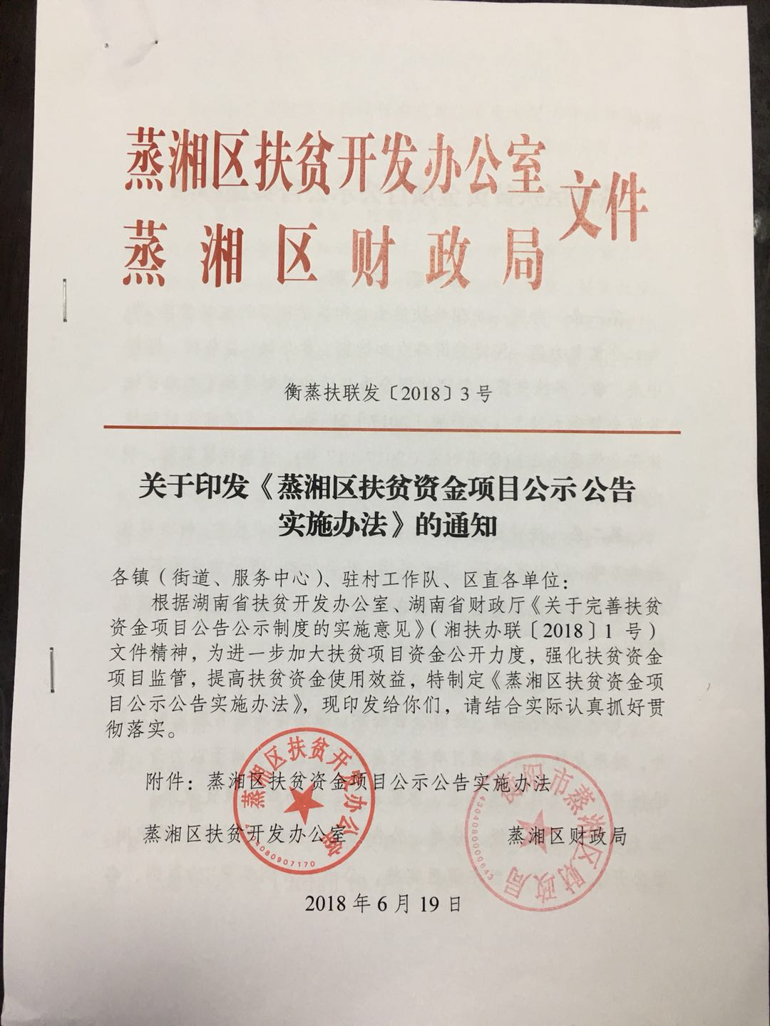 关于印发《蒸湘区扶贫资金项目公示公告实施办法》的通知