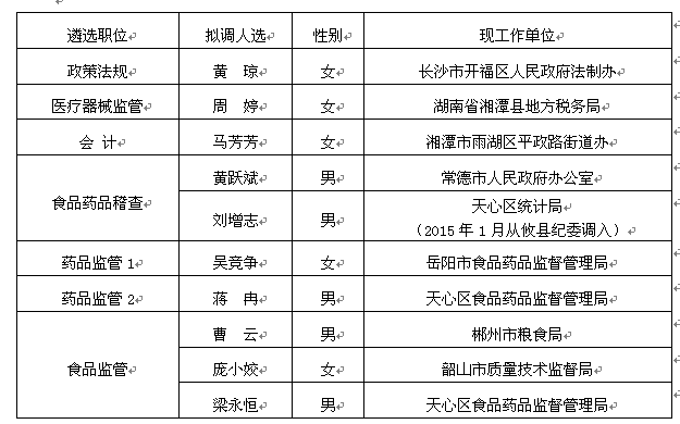 根据中共湖南省委组织部、湖南省人力资源和社会保障厅、湖南省公务员局《2014年省直机关公开遴选公务员公告》及有关规定,经网上报名、笔试、资格审查、专业水平测试、面试、体检、考察等程序,确定黄琼等10位同志为2014年省食品药品监督管理局公开遴选公务员拟调入人选,现予以公示。