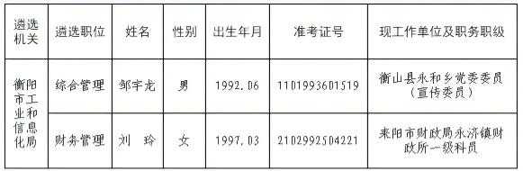 根据《2025年度衡阳市市直机关公开遴选公务员公告》要求,经报名、笔试、资格复审、面试、体检、考察和局党组会议研究等程序,确定邹宇龙、刘玲2名同志为拟遴选对象(试用期三个月)。现按要求予以公示。