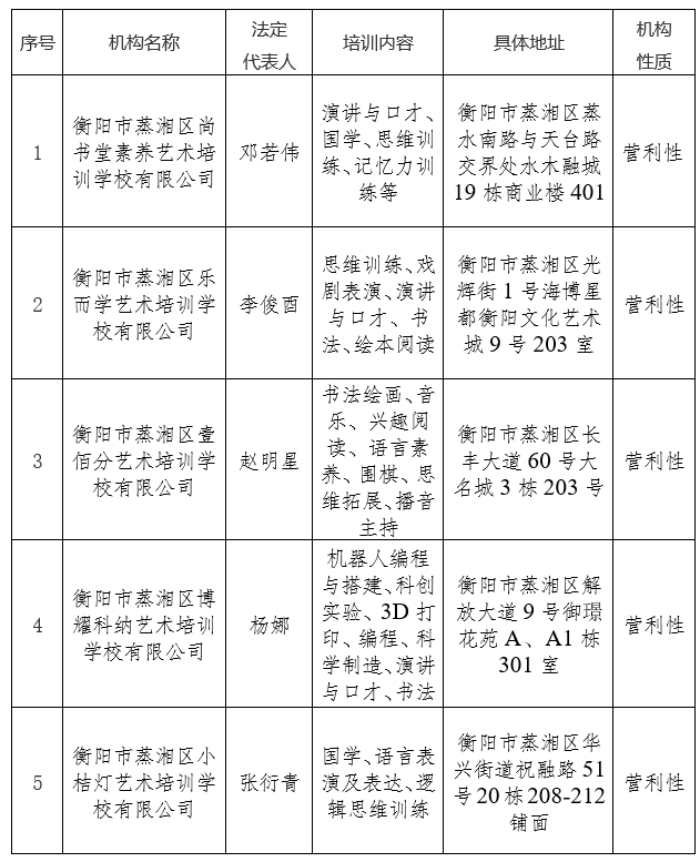 根据《中华人民共和国民办教育促进法》、《中华人民共和国民办教育促进法实施条例》和《湖南省教育厅等八部门关于规范非学科类校外培训机构管理的通知》(湘教发〔2024〕31号)等相关文件规定,经申办人申请,区教育局对申请材料的真实性、合法性进行审验,并组织联合审批相关单位对机构办学场地进行现场踏勘、评估、审核,9所校外培训机构师资、场所、设备、消防等办学条件基本符合非学科类校外培训机构设置标准,拟同意设立衡阳市蒸湘区尚书堂素养艺术培训学校有限公司等9家机构,现依规予以公示。