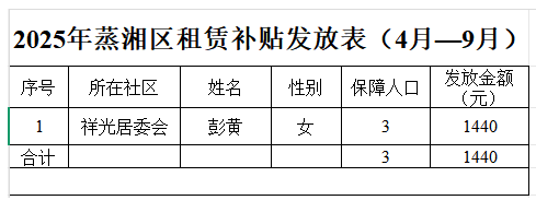 根据《衡阳市城区公共租赁住房管理办法》(衡政发〔2023〕2号),原高新区转隶住房补贴对象彭黄家庭,经审核,拟同意给租赁补贴发放对象彭黄拨付2025年第二、三季度租赁补贴共1440元,现将彭黄情况予以公示,如对公示内容有异议,请在公示期内提出,公示时间2025年11月4日至2025年11月10日。联系电话:0734-8827262