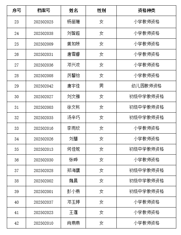 按照申请人网上申请、体检、现场确认、教师资格认定专家审查委员会审查等程序,我局拟通过认定42人(详见附件《蒸湘区2025年第二批次教师资格认定拟通过人员名单》)。