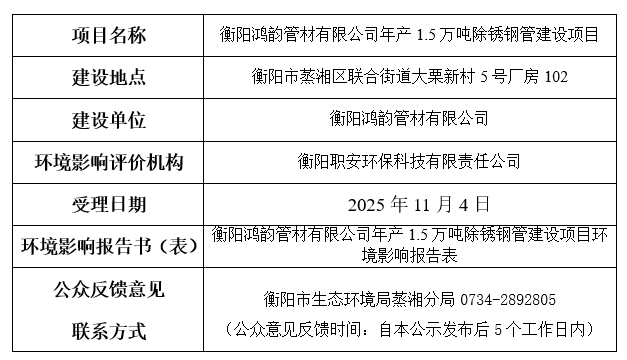 衡阳鸿韵管材有限公司年产1.5万吨除锈钢管建设项目环境影响报告表