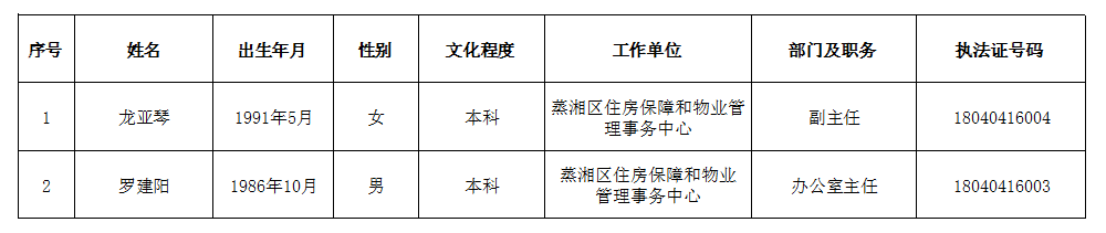蒸湘区住房保障和物业管理事务中心行政执法人员表
