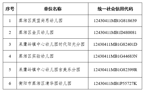 根据《事业单位登记管理暂行条例》及实施细则有关规定,经举办单位蒸湘区教育局同意,蒸湘区英蓝尚思幼儿园等6家单位拟向蒸湘区事业单位登记管理局申请注销登记。