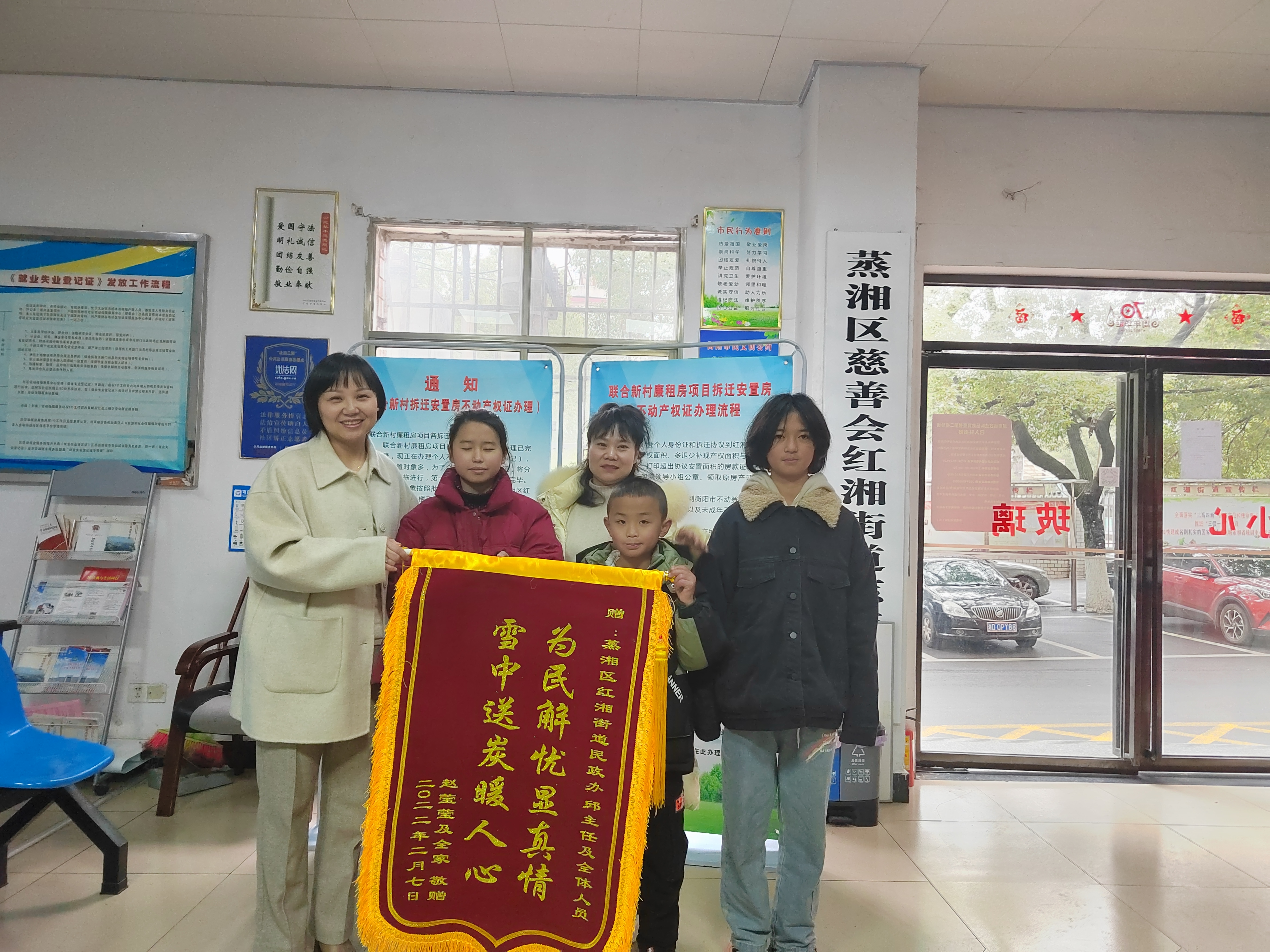 2022年2月7日一大早,蒸湘区红湘街道民政办负责人邱妍和社工站工作人员阳小丽刚到办公室,就被三个半大的孩子堵到了门口,他们礼貌地给两位阿姨送新年祝福,同时送上一面上书"为民解忧显真情,雪中送炭暖人心"的锦旗。
