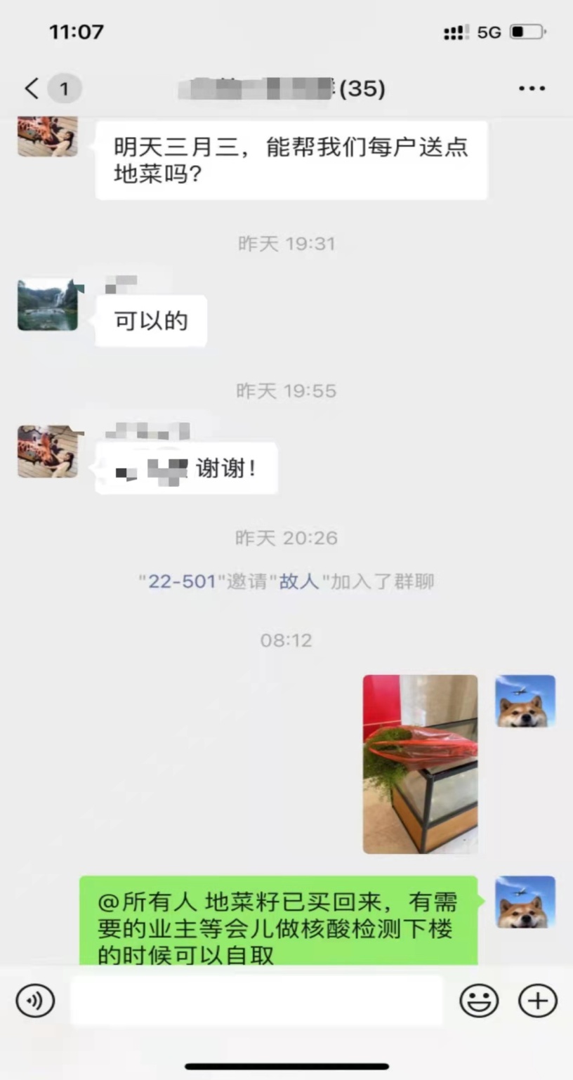 "阿姨,您要的蔬菜我已经放在柜台了""叔叔,您在兴盛优选定的货品到了,东西都全,给您放柜台了""地菜籽买回来了,大家有需要的可在下楼做完核酸检测后自取"······党员志愿者用一个个善意的微笑,一句句贴心的话语,一次次温情的服务,让居家隔离人员感受到了心灵的温暖。