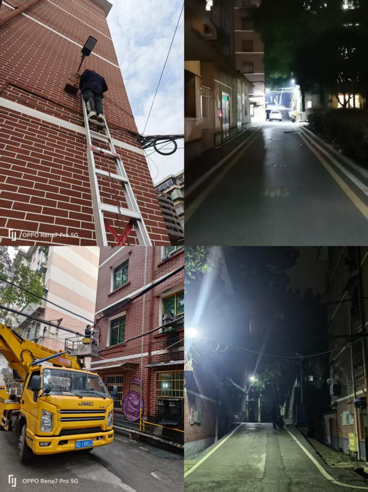 施工过程中,社区工作人员全程跟进监督,衡钢能源中心支援升降车一台配合施工单位作业,合理安排工期,避开居民出行高峰时段作业,最大限度减少对居民日常生活的影响。截至目前,共计新增、更换太阳能路灯20盏,让社区夜晚从“昏暗模糊”变得“亮如白昼”。