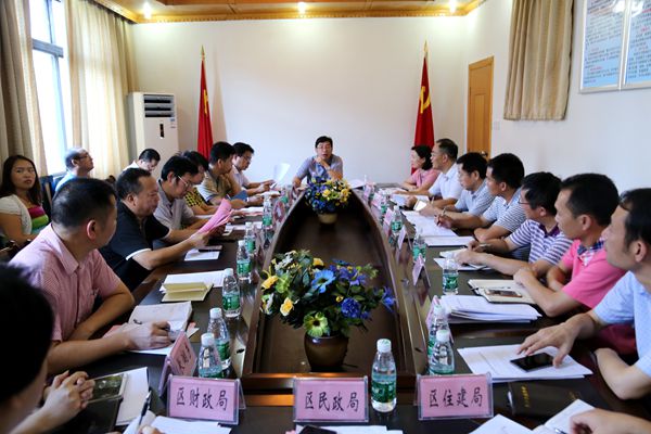 在实地察看了呆鹰岭镇新阳社区和长湖乡廖家湾社区的现址和新址后,邓群策召开现场办公会,听取我区关于社区“两化两体系”建设的情况介绍、困难和下一步工作打算。