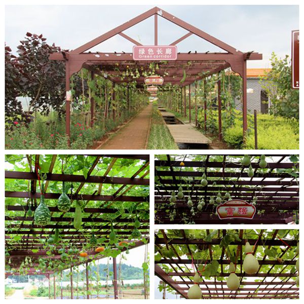 绿色植物长廊里种植的鹤首葫芦、大酒葫芦、蛇瓜、佛手僧帽瓜等新品种的蔬果,透着夏日的活力和新生的力量,吸引了大家的目光。走在瓜果飘香,树木成荫的长廊中,看着错落有致的农家别墅、功能齐全的文化活动场所和农民们脸上洋溢着的灿烂的笑容,不免让人心生惬意。
