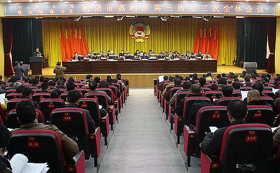 政协蒸湘区三届三次会议开幕 会场布置简洁 新年新起点,新年新希望。没有横幅、没有鲜花绿植,继续延续往年的节俭办会思路。1月14日上午,中国人民政治协商会议衡阳市蒸湘区第三届委员会第三次会议开幕。会场简朴、庄重,气氛热烈而融洽。来自全区各行各业、各条战线的区政协委员齐聚一堂,共谋发展,切实履行政治协商、民主监督、参政议政职能,积极建言献策,为全区经济社会发展贡献智慧和力量。 区领导周玉梅、林喜洋、汪秋明、彭东阳、汪仲兆、云平、陈金生、谢云亚、吴兰湘在主席台前排就座。 区委、区人大、区政府、区政协、区人武部、区公检法在职的区级领导;历届区四大家担任过正处级实职的离退休老领导;区政协正科级以上在岗、退休干部;各乡镇街道、区直及市管各部门、单位主要负责人等应邀出席大会。 本次会议应到政协委员169名,实到151名,符合规定人数。 上午9:00,大会主持人彭东阳宣布:政协衡阳市蒸湘区第三届委员会第三次会议开幕。全体起立,会场内响起雄壮的国歌声。 汪仲兆代表政协蒸湘区第三届委员会常务委员会,向大会报告工作。 报告指出,2013年是本届政协开局之年。一年来,区政协常委会深入贯彻落实科学发展观,认真学习贯彻中共十八大和十八届二中、三中全会精神,牢牢把握团结和民主两大主题,自觉服从和服务于全区工作大局,认真履行政治协商、民主监督、参政议政三大职能,团结动员各民主党派、人民团体和社会各界人士,紧紧依靠广大政协委员,竭智尽力谋发展,凝心聚力促和谐,创新举措增活力,扎实履职树形象,为推动全区经济社会又好又快发展作出了积极贡献。 2014年,是区政协工作承前启后的关键之年,也是深入开展群众路线教育实践活动的重要之年,做好今年的工作意义重大。新的一年,区政协要在中共蒸湘区委的领导下,坚持省政协提出的“忠实履职、奉献湖南,在全面建成小康社会中彰显政协价值”的工作理念;坚持“准确定好位、履职不缺位、尽职不越位、工作做到位”的工作原则;坚持“履行职能更为主动、日常工作更加扎实、事业发展更显活力”的总体要求。紧紧围绕中共蒸湘区委确定的目标任务,进一步解放思想,开拓创新,积极履行职能,充分发挥人民政协协商民主重要渠道作用,为全面建成“山水宜居”小康蒸湘作出新的贡献。 吴兰湘受政协蒸湘区第三届委员会常务委员会的委托,向大会报告区政协三届一次、二次次会议以来提案工作情况。 政协三届一次、二次会议以来共收到委员提案120件,其中三届一次会议收到提案108件,三届二次会议收到提案12件。经整理,共立案交(转)办115件,区内承办的106件已全部办理完毕,并及时书面回复,送达或寄给提案人。 大会先后听取了区政协委员陈国安、谢品刚、谢庭知、黄文洁、颜娟华的发言;还表彰了2013年度先进政协联络工委、“三好界别”、“四有委员”、优秀提案及提案承办先进单位。