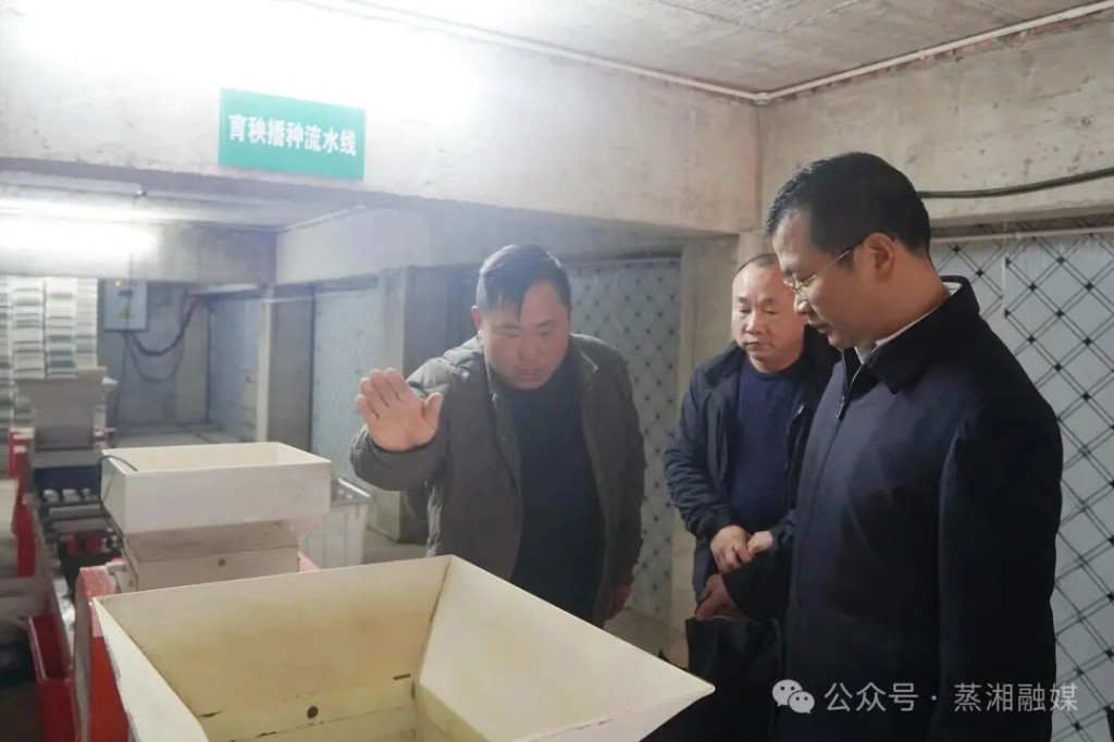 呆鹰岭镇土桥村湖南亿湘农生态农业发展有限公司集中育秧基地,全自动育秧流水线高效运转,装盘、播种、覆土等工序衔接有序。作为“衡阳市农业产业化龙头企业”和粤港澳大湾区“菜篮子”生产基地,这里推行“暗室催芽+大棚炼苗”工厂化育秧模式,单批次可服务大田2000亩以上,同时面向周边农户提供“订单育秧+全程托管”服务,配套开展机插、机收等农机社会化服务,有效提升育秧质量和种植效率。曾梦龙对此给予了充分肯定,他指出,科技是农业发展的重要驱动力,要充分发挥龙头企业和专业化服务组织的示范带动作用,推动育秧生产向专业化、社会化、规模化方向发展,不断提升农业生产效率和服务水平。