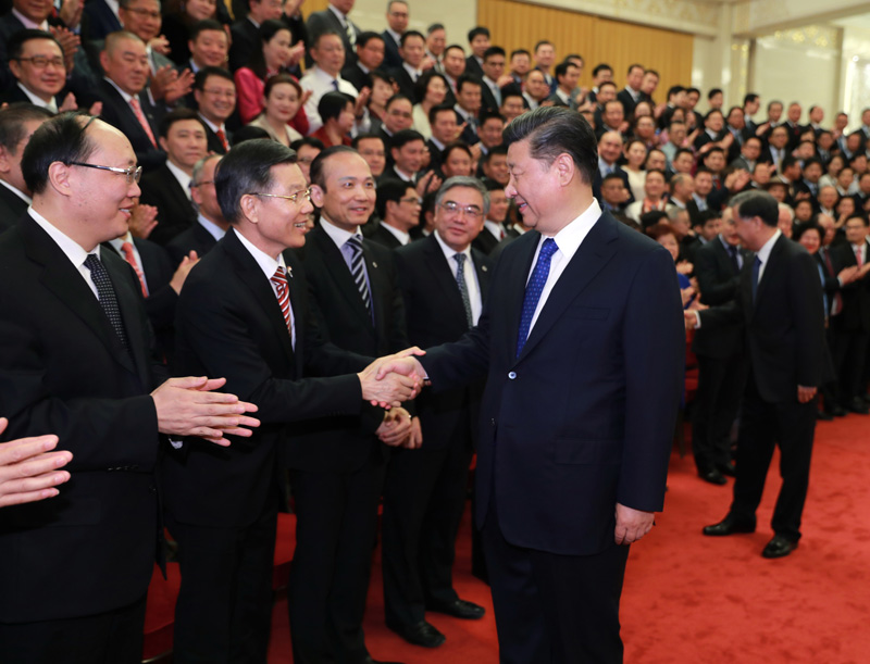 上午11时,习近平等来到人民大会堂北大厅,全场响起长时间的热烈掌声。习近平等同代表们亲切握手,不时交谈,并同大家合影留念。